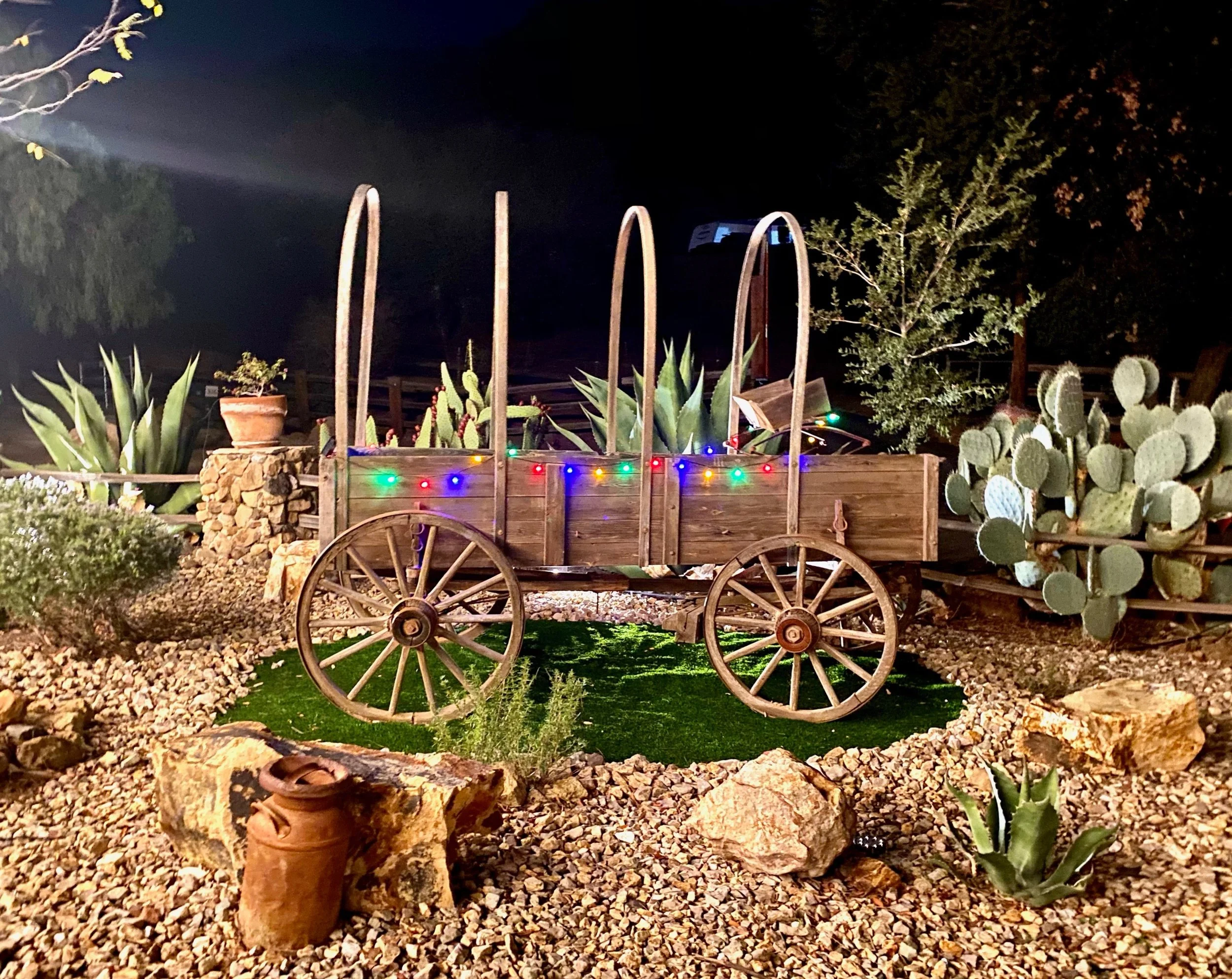 A covered wagon decorated with Christmas lights.