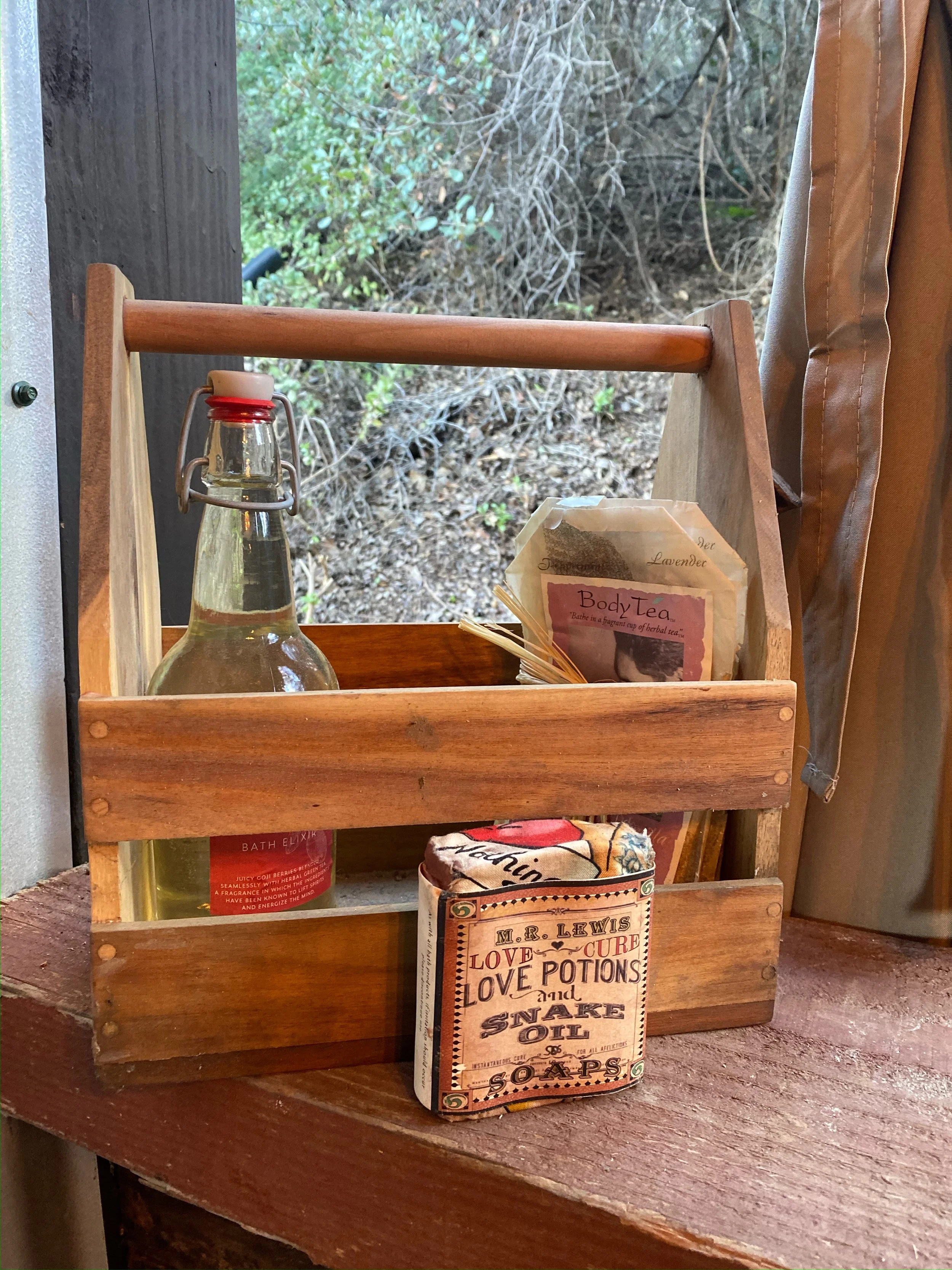 Want to experience the feeling of camping out under the stars, but in style? Meet our Safari Tent. Instead of a sleeping bag, you get to collapse into a large, comfy bed at the end of a long day. A defining feature of this Airbnb is that the tent has the option of either staying closed or open, giving the feel of sleeping out in nature, if you so wish. The tent comes with two flaps. The outer one is made of canvas, and the inner one is made of a mesh material. This gives guests the opportunity to keep the “door” open, if you will, without having to worry about bugs or animals coming inside. Or, if you prefer more privacy, you can close the canvas flap to give utter seclusion from the outside world. Both the Safari Tent and the Contestoga covered wagon share a beautiful outdoor bathroom that features both a bathtub and shower, with the company of just nature as you relax while also refresh yourself at the same time.