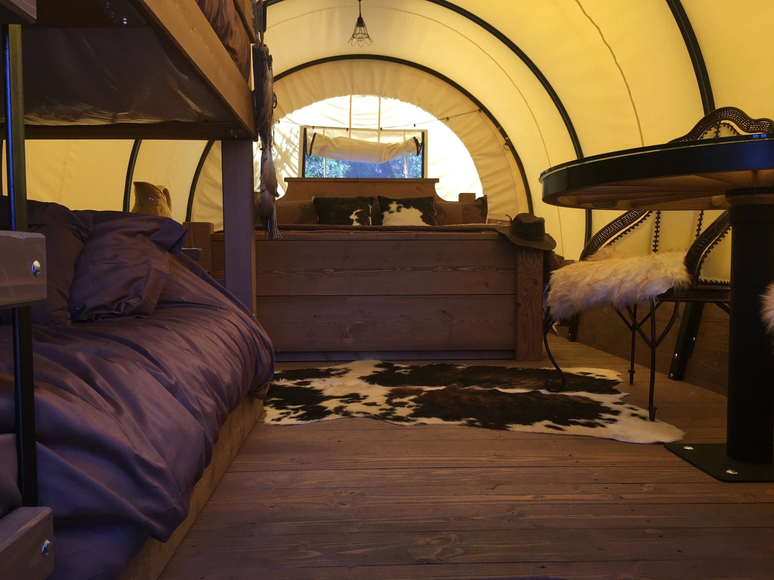 If you want to go back in time even farther, consider our Conestoga covered wagon. You will be transported to the Old West, but in style. Want a rustic glamorous western theme? We got it. You can share the large bed centered in the wagon if you want to cuddle with your significant other, or take the bunk beds to the side and the large bed if you are with a group of your friends. The small wagon table in one corner of the wagon is perfect for morning coffee, or a game with everyone circled around it. Whatever way you want to spend your Valentine’s Day weekend, it can be applicable to your needs.